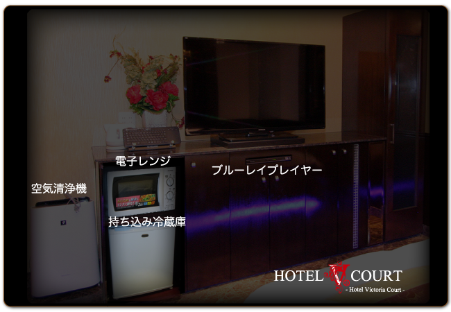 ・VOD(最新映画など見放題)・大型液晶TV(フロントHDMI入力端子付)・ブルーレイディスクプレイヤー・客室専用無料Wifi・客室インターネット・有線放送・ルームコントローラー・スマホ用充電コンセント(USB)・シーン調光・レインボー照明・空気清浄機・持ち込み冷蔵庫・システム冷蔵庫・電子レンジ ・電気ポット・レインボーバス・ジェットバス・ブロアバス・浴室TV・シャワートイレ・ナノケアヘアードライヤー・カールドライヤー・ストレートアイロン・男性/女性化粧品・アメニティ豊富 |