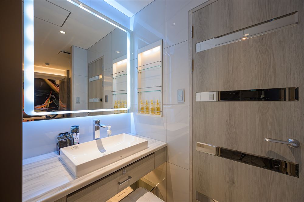 基本設備 VOD(最新映画など見放題)・大型液晶TV(フロントHDMI入力端子付)・客室専用無料Wifi・客室インターネット・有線放送・ルームコントローラー・スマホ用充電コンセント(USB)・シーン調光・レインボー照明・空気清浄機・持ち込み冷蔵庫・システム冷蔵庫・電子レンジ ・電気ポット・レインボーバス・ジェットバス・ブロアバス・浴室TV・シャワートイレ・ナノケアヘアードライヤー・カールドライヤー・ストレートアイロン・男性/女性化粧品・アメニティ豊富(お部屋によって一部設備が異なります。)