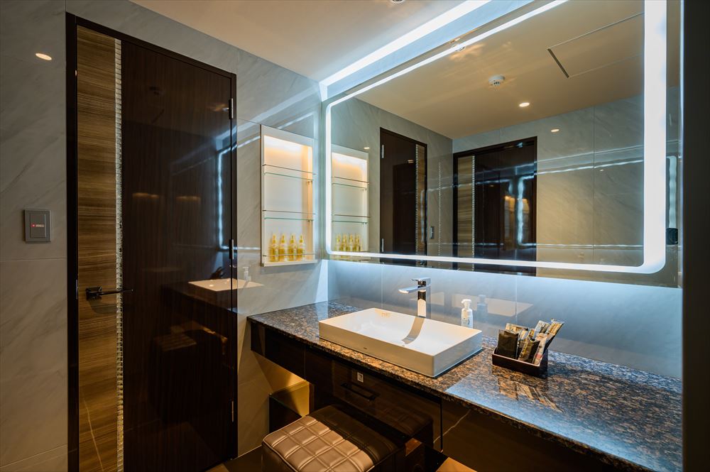 基本設備 VOD(最新映画など見放題)・大型液晶TV(フロントHDMI入力端子付)・客室専用無料Wifi・客室インターネット・有線放送・ルームコントローラー・スマホ用充電コンセント(USB)・シーン調光・レインボー照明・空気清浄機・持ち込み冷蔵庫・システム冷蔵庫・電子レンジ ・電気ポット・レインボーバス・ジェットバス・ブロアバス・浴室TV・シャワートイレ・ナノケアヘアードライヤー・カールドライヤー・ストレートアイロン・男性/女性化粧品・アメニティ豊富(お部屋によって一部設備が異なります。)