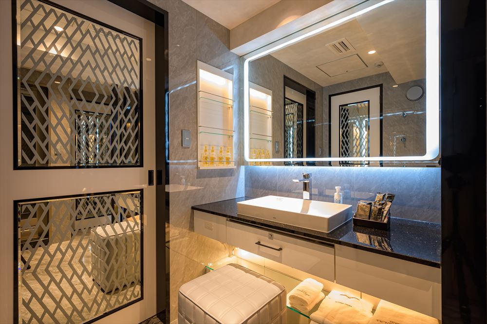 基本設備 VOD(最新映画など見放題)・大型液晶TV(フロントHDMI入力端子付)・客室専用無料Wifi・客室インターネット・有線放送・ルームコントローラー・スマホ用充電コンセント(USB)・シーン調光・レインボー照明・空気清浄機・持ち込み冷蔵庫・システム冷蔵庫・電子レンジ ・電気ポット・レインボーバス・ジェットバス・ブロアバス・浴室TV・シャワートイレ・ナノケアヘアードライヤー・カールドライヤー・ストレートアイロン・男性/女性化粧品・アメニティ豊富(お部屋によって一部設備が異なります。)